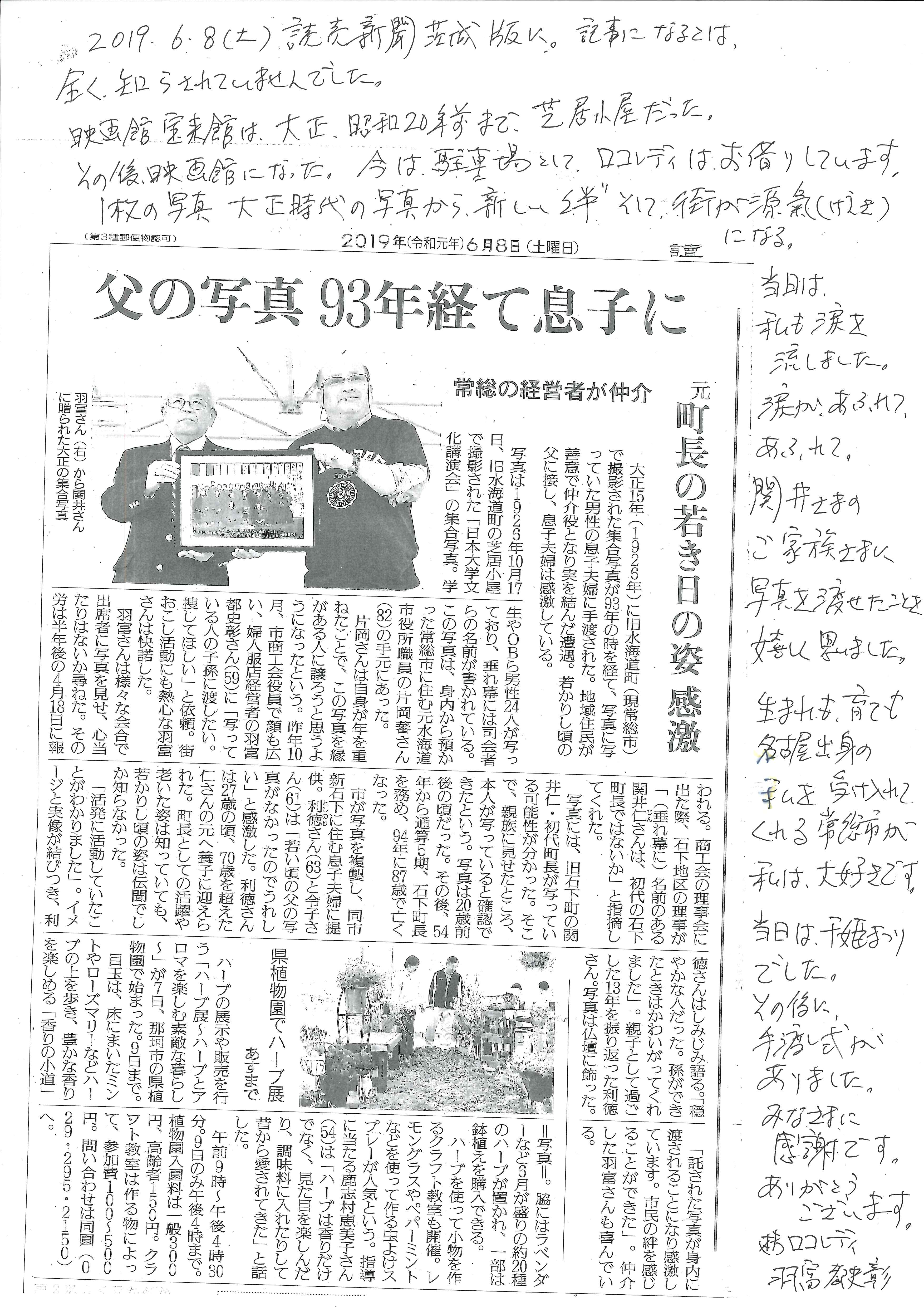 まったく、まったく知らなかった。「はとみさん、読売新聞の朝刊に載っていますよ。 茨城版に載っていますよ。」とある人から 連絡を頂きました。取材は、受けていましたが、千姫祭り時に取材。5月12日の日曜日でしたが、まったくその後は、連絡が無かったです。この1枚の写真から、数々の人とのつながりを頂きました。もしかしたら、商人には、仲人かもしれませんね。(笑)商品とお客様をお見合いをさせるかんじでしょうか?不動産屋さんで言うと、仲介(ちゅうかい)。貸主と借主のお見合い。私は、婿養子でした。茨城県に来てロコレディに入社したのが、昭和62年の10月です。親戚もいないこの茨城県で皆様とご縁を頂きました。常総市が、私は、大好きです。ご縁を大切にします。