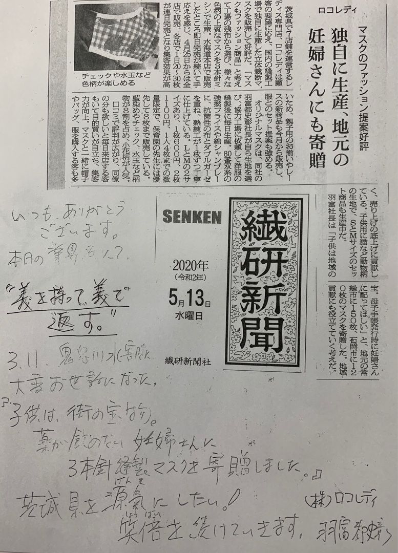 今、営業時間を短縮して、営業をしております。水海道R2カフェ店は、10時30分~15時です。レディースアパレル店舗は、10時15分~17時15分の営業時間となっております。6月末まで、毎週水曜日が、お休みを頂いております。布マスクを作り出して、縫製工場によく出かけるようになりました。型紙を何度も、何度も見直す。素材の選定も行います。縫製工場とのコラボ。ある意味「布マスク作品」と言った方が良いかもしれませんね。1枚1枚、丁寧に仕上げていく。その姿を観ながら、微調整をお願いする。例えば、お皿も安ければ、100円ショップでも販売している。益子焼とか、笠間焼の器で、ごはんを頂く。お茶を飲む。おいしく感じる。髪の毛を切るときも、1,000円カットに行く人もいれば、美容室で、10,000円以上お金をかける人もいる。この私も、床屋のばぁさんのところで、4,000円近くのお金をかける。マスクも、ウィルス菌から守るなら、使い捨てマスクとか、衛生上を第一に考えたマスクをするでしょう。マスクをすると、これからの季節暑く感じる。マスクをすると、しゃべりづらい。マスクをすると、息苦しい。などなど色々なご意見を伺うことになりました。優先順位をどこに持っていくのか?????????それによって、おすすめするマスクも異なってきます。型崩れしない。生地が、縮まない。縫製がしっかりしている。だから、ロコレディは、3本針縫製ミシンと、パイピング仕上げのマスクを依頼しました。裏地も、肌に優しく感じる素材を考えて、考えて。耳ヒモも、痛くならない素材を使う。オシャレなマスクを考える。息苦しく無いマスクを考える。リフォームの工事と同じです。水回りを優先するのか?介護の考えを優先するのか?イメージを大切にするのか?それによって、コスト(価格)も変わってきます。布マスク(3本針縫製の場合)、丁寧に洗えば、6か月は、使用できます。1日当たり、10円しないです。キッチンペーパーや、ティッシュ、ガーゼを充てる。お客様から、励ましのお言葉を頂きました。「お店が、コロナ禍の影響で、廃業や、退店するお店が増えてきた。 出来るだけ、出来るだけ、地元で買い物をしたいです。」といわれました。ありがとうございます。ありがとうございます。失礼ながらも、お客様のことを家族の一員として、考えています。