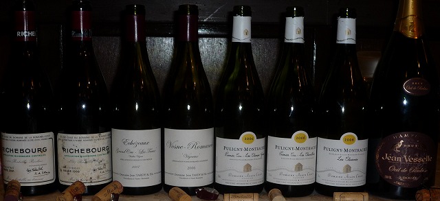 先週は2回ルイ・ジャドのバレル・テスティングに行って、その帰りに2次会・3次会とあって、ワイン会も別途何時も通り・・・仕事の飲みも入って・・・飲酒的に超多忙で、目が疲れてブログの更新が出来ませんでした。にも関わらず多くの方に見て頂いて深謝しています。と言う事で忘れないうちに怒涛の1週間100種以上の記録を書きます。先ずはDRCのワイン会の様子からです。 シャンパーニュジャン・ベッセル ブリュット マグナム白ワインピュリニー・モンラッシュ シャルム 2006 アラン・シャヴィーピュリニー・モンラッシュ 一級 クラヴァイヨン 2006 アラン・シャヴィーピュリニー・モンラッシュ 一級 シャン・ガン 2006 アラン・シャヴィー赤ワインヴォーヌ・ロマネ 2006 ジャン・タルディエシェゾー レ・トゥルー VV 2007 ジャン・タルディリシュブール 2001 DRC No07047リシュブール 1998 DRC メニュー オリーブ2種 的矢産 佐藤養殖場の生牡蠣 les3鴨腿肉のスープ 真鯛のポワレ ふきのとうのリゾット添え鹿児島産 青首鴨のロティフロマージュ実に素晴らしいディナーでした。DRCのコンディションもよく美味しかったです。2次会に飲んだレヴァンジルの96が素晴らしく、暗黒の様な深い味わいに驚きました。この日はかがり火に友人が来ていたので、日本酒の美丈夫「夢許」を飲んだのですが、それがこの一週間の辛い二日酔いの始まりなのかも知れません。