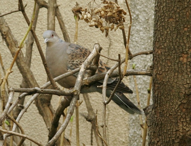 キジバト君が飛んで来ました。体は太っていて大きいのですが、気が弱いです。まあだから鳩は平和の象徴なのか・・・自分より体の小さいヒヨドリに追っ払われます。空中戦やった事もありますが、負けて退散します。体が重いので餌場にも止まらず、地面の餌を食べています。フランス料理には良く登場する鳩ですが、日本人はあまり好きではない様ですね。非常に滋味のある血液分の多い肉で私は鴨より好きです。大きい鳥なので食べごたえもあります。でも養殖の鴨より肉にすると小さいです。