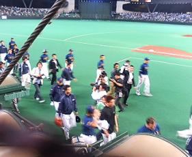 昨日の3試合で今季のパリーグ公式戦は全日程を終了した。早いもので3月末から書き続けてきた「今日(昨日)の近鉄バファローズ」シリーズも今シーズン最後となる。昨日は内外野自由席無料解放という噂を聞きつけインボイス西武ドームへ行ってきた。オリックスのあまりの完敗に疲れてしまい(苦笑)昨日の試合の日記を書きながら途中で寝てしまったので今日に持ち越した。インボイスでの雑感は明日あらためてということで。(インボイス西武ドーム)オリックス0-7西武私は西武の打撃練習を観に行ったのか(苦笑)。パウエルは4回2/3を6被安打7奪三振3与四球5失点で降板。上の写真はパウエル交代の瞬間の写真。香月は打者1人をきっちり抑えた。打線はほとんどオリックス、スタメンは大西と阿部ちゃんのみ。大西4-0、阿部ちゃん3打数1安打。筧が途中出場で1打席回るが凡退。観衆22248人って無料の人数も数えてるんだろうか。2時間56分の試合。(福岡ヤフードーム)東北楽天5-6福岡ソフトバンク高須ノーヒット、吉岡1安打。礒部16号ホームラン含む2安打1打点。川口2安打1打点、藤井1安打。牧田代走で出場、長坂は最後の試合も守備のみ。大村は2安打1打点1けん制死。有銘5回2/3を11安打3奪三振2四死球6失点で降板。吉田トヨさん1イニングを1被安打のみに抑える。観衆31802人、3時間15分の試合。試合後ライトスタンドからも田尾コールが起こり田尾さんが胴上げされてソフトバンクから花束受け取る。それはそれで感動的なのだが、最近胴上げの安売りが目立つ。ちょっと複雑な気持ちでVTRを見た。ついでに今季成績も。オリックス 62勝70敗4分、勝率.470、1位と26ゲーム差。 打率.260、防御率3.84、 得点527、失点587、44盗塁。東北楽天 38勝97敗1分、勝率.281、1位と51.5ゲーム差。 打率.255、防御率5.67、 得点504、失点812、41盗塁。楽天の1位とのゲーム差50以上は史上3チーム目。勝率2割台はワースト7位。記録ずくめの1年であった。