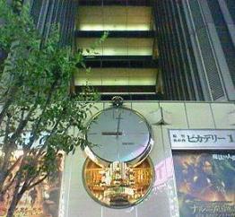 お取引先の方の送別会があり銀座へ行った帰り道、有楽町マリオンの時計が9時を指して、音楽が鳴り響いて、ご覧のような光景が。時計が上に移動して中から金色の回転する物体が出てきた。ゴージャスな色のわりに可愛い(笑)。携帯電話のカメラなので、なんか光ってるぐらいにしか見えないのが残念。日本への観光客であろうか、外人のお姉さん3人衆もこの時計をカメラに収めていた。外人と言えば、7月に入って首都圏はどこもかしこも警官の姿をやたらと街で見かけるようになった。洞爺湖サミットのための警備と言うが、どうして北海道で行われるサミットで首都圏も厳戒態勢に入るのか、イマイチよくわからない。まあ、何事も無い事を心から祈るばかりだ。このマリオンの前を定時に通った事は今まで何回あっただろうか。おそらく10回も見ていないだろうと思う。見たからどうだという事は何もないが、ちょっとラッキーな小さな幸せを味わった、東京銀座の夜9時の風景。