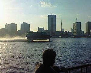 久しぶりの東京湾クルーズ(笑)。東京ビッグサイトで展示会があると帰りの恒例のお楽しみ、有明客船ターミナルから日の出桟橋まで水上バスに乗船した。少し時間がかかるが、都心へ戻るのにゆりかもめやりんかい線に乗るよりも、潮の香りと風を感じながらのこのコースが最高だ。お台場やレインボーブリッジを見ながら、東京タワーや東芝本社ビルがだんだんと大きく見えてきて、船が日の出桟橋に近づいたところで、急に船の速度がゆるやかになったと思ったら、目の前を猛スピードで船が通り過ぎていった瞬間が上の写真。海上警備隊?なんじゃそら(笑)。何の船だろう。何かよくわからなかったがすごい早さだった。海の上でも道の譲り合いがあるのねん。久しぶりにひとときの観光気分を味わい、とことん歩いた展示会の疲れを癒してもらった。