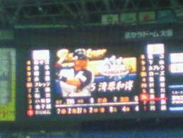 京セラドームのオリックスと日本ハムの試合の切符が手に入り、行ってきた。大ちゃんと梨田さんの近鉄対決の初観戦。これは関東ではなかなか観れないので有り難かった。試合はオリックスのいてまわれ投手陣のお陰で22安打10得点を取った梨田さんの大勝。近鉄ファンとしては坂口や下山、ローズ、北川のヒットを見れて、香月の姿も久々に拝め、吉井、清川コーチの姿も何度も見る事ができた。前日の土曜日の試合だったら我らが近鉄の星、山本省吾の10勝が見れたのでちょっと残念。この日の大勝は前日に元部下にいてまわれた、梨田さんの仕返しだったのかもしれない。プレーオフで再度大ちゃん対梨田さんの対決が見たいし、駄菓子屋の試合はノーゲームになったのでこういう時に勝っとかないとあかんしね。そんな中、ハイライトシーンは9回裏に清原が代打で登場、三振に倒れたものの、感動の瞬間だった。打者は北川なのにネクストバッターズサークルに清原が登場するとドームは大歓声で大盛り上がり。「とんぼ」が流れてバッターボックスに向かうとドームのボルテージは最高潮に。もしかしたら生で観れる清原は最後かもしれない。今季はもう京セラドームで試合を観る事はないだろう。「とんぼ」に乗って登場する清原は私にとっては生で観る最後の機会だと思うと、携帯で写真を撮りながら泣けてきてしまった。仰木さんが作った男の花道、清原の勇姿を天国の仰木さんは見届けてくれているだろうか。