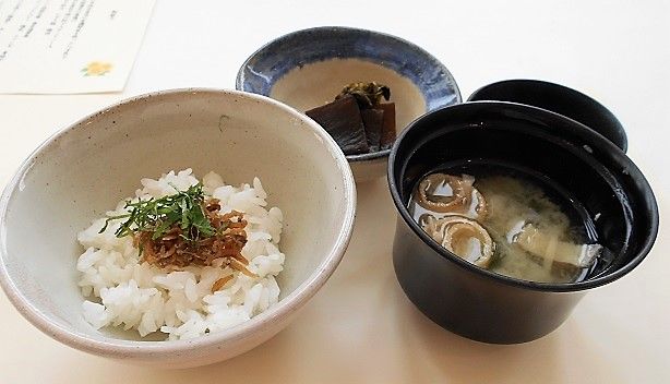 お食事は、紫蘇じゃこご飯、味噌汁と香の物。御飯は残さないように半分にしてもらいました。