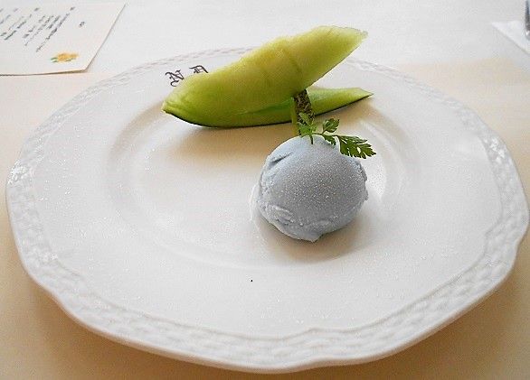 デザートは、ひと口メロンとブルーソルトアイス。お塩の味がするアイスが美味しいです。