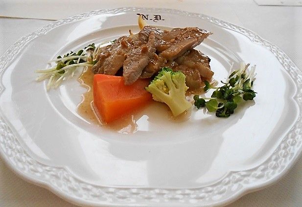 主菜は、ガリシア栗豚塩こうじ漬けのオーブン焼き、淡路玉葱 人参の旨煮 ブロッコリー 貝割れ添え 玉葱ガーリックソース。