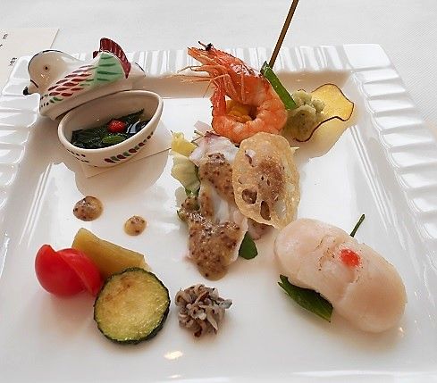 前菜は、天使海老の唐揚げ、明石産茹で蛸の粒マスタードソース、炙り帆立の握り寿司と、神戸市西区直送の有機野菜を使った八寸色々。新鮮な食材を生かしたお料理です。