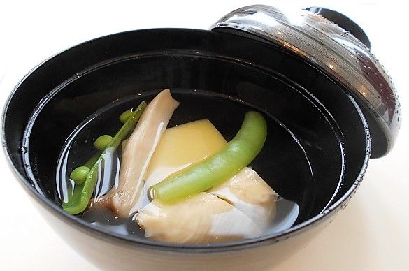 椀物は、もろこし胡麻豆富、海老の湯葉巻き、スナップエンドウ、エリンギ、じゅん菜。お出汁のお味が胡麻豆富の自然な甘みを引立てます。