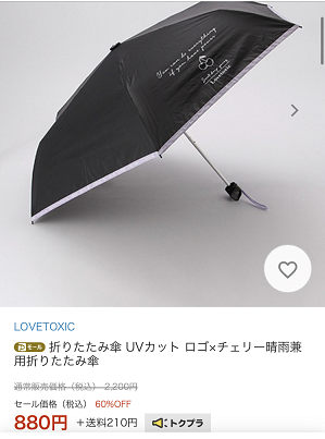 こんばんは。z〇z〇のタイムセールで購入したラブトキのお品が届きました(次の日に1000円クーポン出ましたけど~)晴雨兼用折り畳み傘60%OFFタオルハンカチ2枚セット44%OFF自分服も買いましたがそちらは割愛^^;チェリープリントが可愛い思ったよりもしっかりしていて強風にも耐えられそう今次女が使っている折りたたみ傘は軽い代わりにやっぱり強い風には弱くてちょっと重くなるけどこれをランドセルに入れとく傘にしようかな。。。ボタンを押して開けるタイプ。指が痛くならなくて良いですね~閉じるのもカンタンでした同じものは売り切れですがコチラ↓同タイプだと思います。ラブトキシック(Lovetoxic)晴雨兼用折り畳み傘タオルハンカチ2枚セットはコレ↓40%OFFラブトキシック(Lovetoxic)2枚SETハンドタオルまだあります。NARUMIYA ONLINE(ナルミヤ)さんはポイント10倍&送料無料ですね1000円OFFクーポンを使いたいなぁラブトキの新作にニットカーディガンが欲しい。。。ラブトキシック(Lovetoxic)ニットカーディガンでもカーデってセールに残りやすいのですよね…ラブトキシック(Lovetoxic)メッシュ裏つきブルゾンラブトキシック(Lovetoxic)ボアパーカラブトキシック(Lovetoxic)タックワイドパンツタブレットケース買わないといけないのですがコレ↓イイな~ラブトキシック(Lovetoxic)タブレットケース一番上のカーデと一緒に買おう!と思ったらクーポンまであと50円足りない・・・☆1000円OFFクーポン☆シルバーウィークアウトレットセール