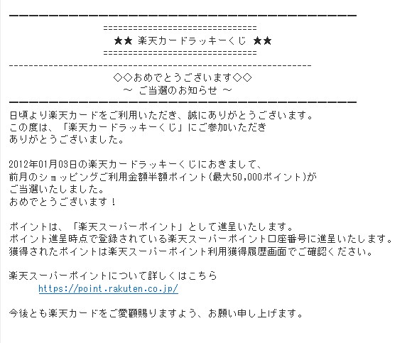 高額ポイントが初めて当たりました。でも、これって楽天市場限定?それとも楽天カード?高額が当たっても、少ししか使ってないので…残念です(T_T;)