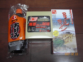 ずーーーーーっと前にわたしが初カウプレをやったとき見事にカウプレゲットしてくださったのぎす屋よーこさんそのよーこさんから素敵なお返しの品が届いていたんです~よーこさん、ごめんなさい~~~~~~早くアップしようと思っていたのに。。。よーこさんらしいセレクトで???主人と大ウケ~海軍さんって???ああ~~~~~~このソース、うんまひぃ~んですよね!!以前広島の方に教えていただいて広島に嫁ごうかと思っていました~このソースと、焼酎のために(爆)この和柄の布素敵なんです~~~~~~~~♪こんなに素敵なものをいただいちゃって恐縮です。。尾道ラーメン今夜いただこうかと思っています。だって~~~~~~どんぶり両方とも買っちゃったので(笑)そうそうみなさんはお持ちですか???主人に聞いたら「寝巻きみたい・・・」最近冷たいんですうちの主人以前は「うん、可愛いと思うよ~」なんて言ってくれていたのに。・゜゜・(>_