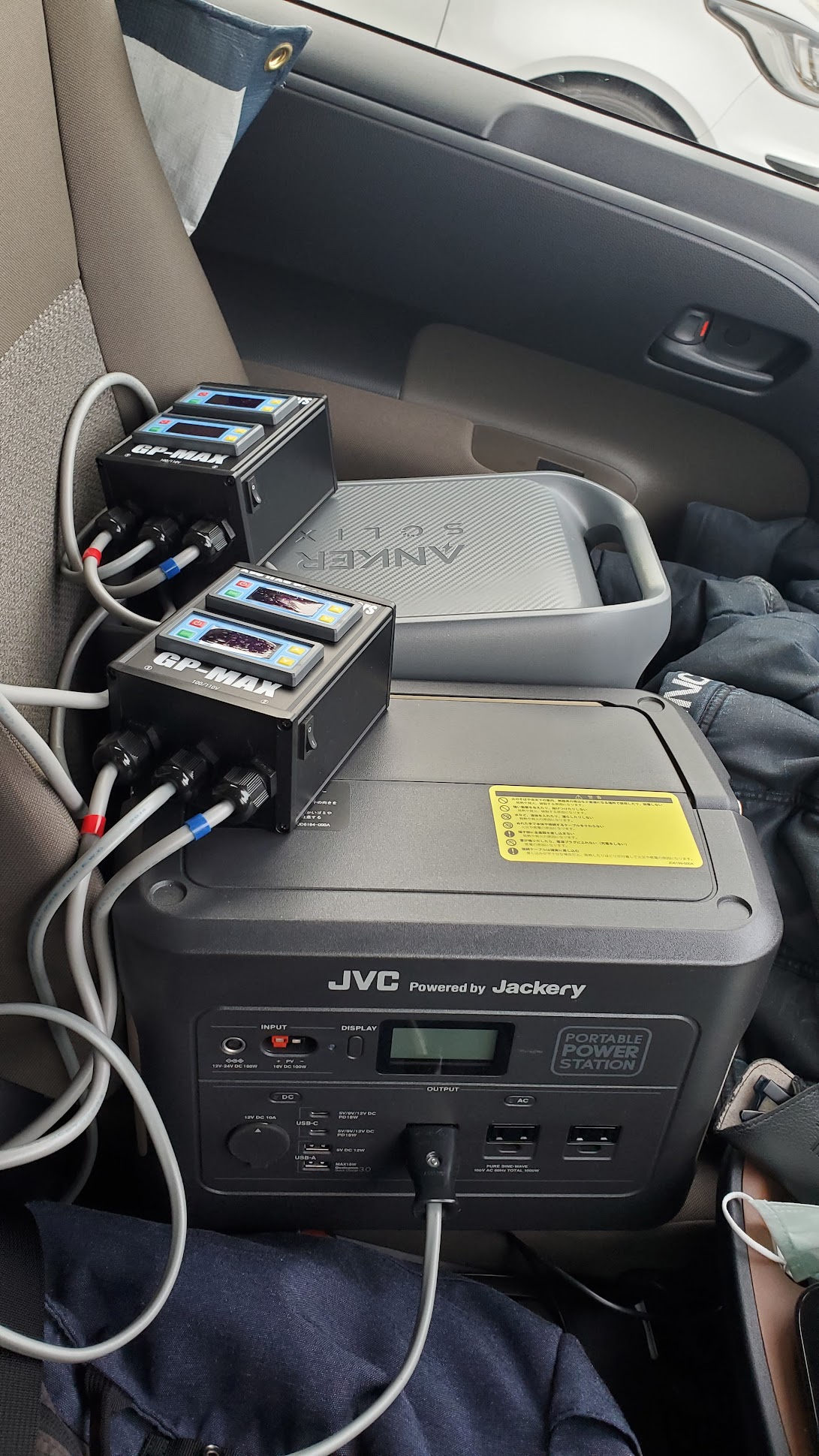 発電機は持っているのですが1600Wと微妙・・・。何故かというと、2000W以上の発電機はサイズ的にFDに積めないからです。1600Wでも2本ずつ交互に温めると何とかなりますが、たまたま自宅にあったポータブル電源を使用してみました。JVCの1000W(peak2000W)を所有していました。Peak2000Wなので4本同時には温められませんが、2本ずつ交互では全く問題ありませんでした。利便性が高かったのでankerを増設。こんな感じで使用します。1000W(peak2000W)が2台あると4本同時に温められます。以前黄色のブーストアップで筑波をアタックした際は、助手席を外し295/30のタイヤ4本と1600Wの発電機を積み込み自走していました。これで何とかなるのですが、発電機はオイル管理やレギュラーガソリンの準備があります。また、ワイヤーを引っ張り起動しますが結構コツが必要で、色々面倒だなと思っていました。ポータブル電源は1000Wだとコンパクトで軽く、問題なく助手席に2台置けます。タイヤの保管、電源が車内で完結するので、車内の暖房を全開にしていると、そもそもタイヤ・ホイールがそこそこの温度に保てます。タイヤをサポートカーに積み込む際にウォーマーを巻いているので、現場ではスイッチを入れるだけです。1000W(peak2000W)の2台体制では、タイヤ4本を温めつつ、700Wのふとん乾燥機も同時使用できるので、ホイールも温めることが出来ます。この状況で2セットは問題なく温められますが、来シーズンに備えセールがあったのでオプションバッテリーを追加しました。4本温める電気量は今シーズン確認していますが、ここまで準備すれば、ふとん乾燥機併用でもバッテリー切れの心配がなくなります。ポータブル電源は各メーカーが定期的にセールをしていますので、時期を狙えば発電機よりリーズナブルだと思います。