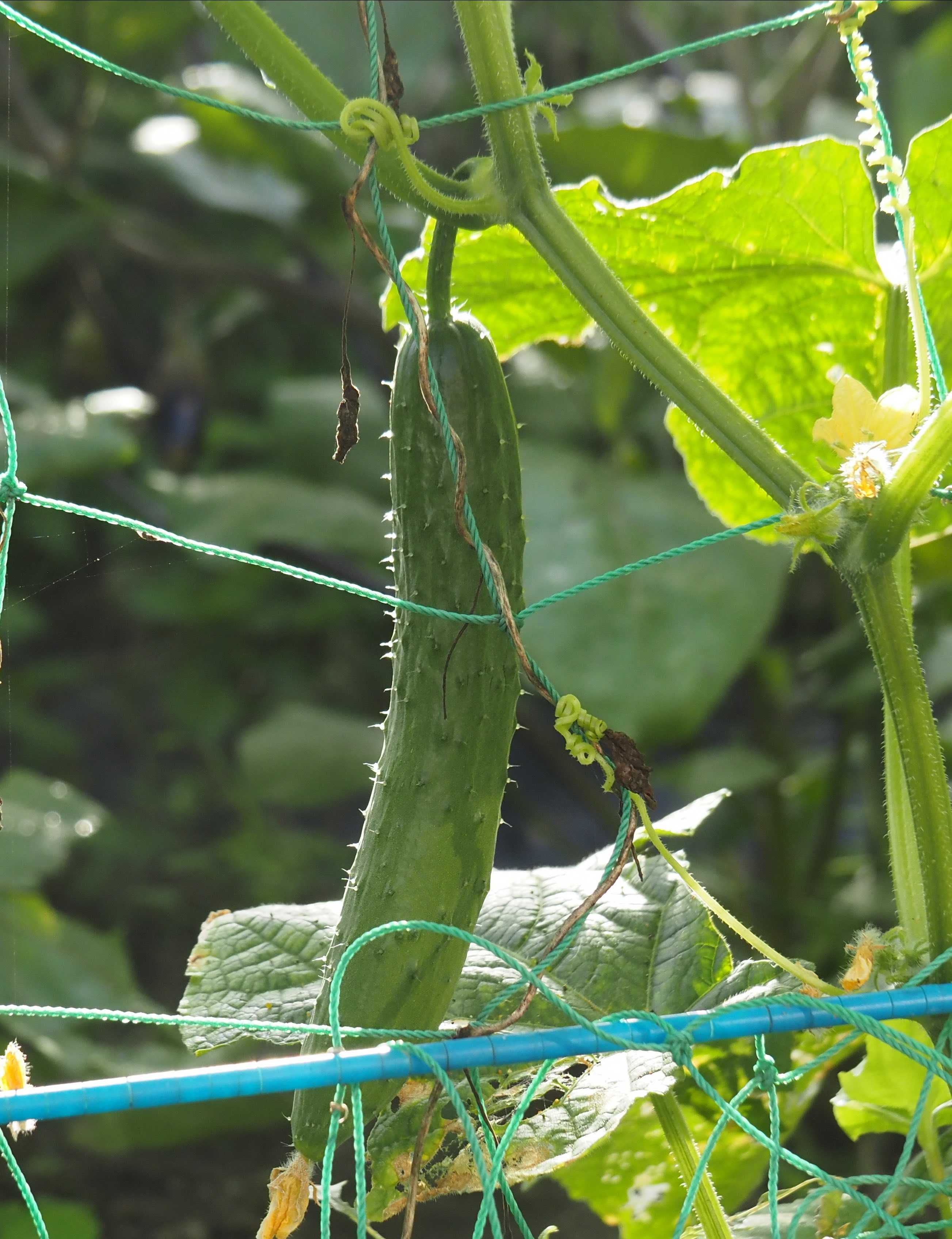 この夏の暑さを利用?して、1度目のキウリの株が枯れ上がった後に、少し離れた所で2回目の種まきをした。言わばキウリの二期作。もっとも、生産農家では植え付け時期をずらして均等に収穫量を確保されているのであろうとは思う。ここに来て1本目が収穫できた。写真だとずいぶん大きく写せるが、20cmくらいのものだ。次の候補はこっちはまだ10cmくらい。葉っぱの上で横になっているのだからかわいいもの。さて、今日から急に涼しくなった。いつまで収穫できるかな。暑い間は夕方になると葉がよれっとなっていたが、今は元気なものだ。