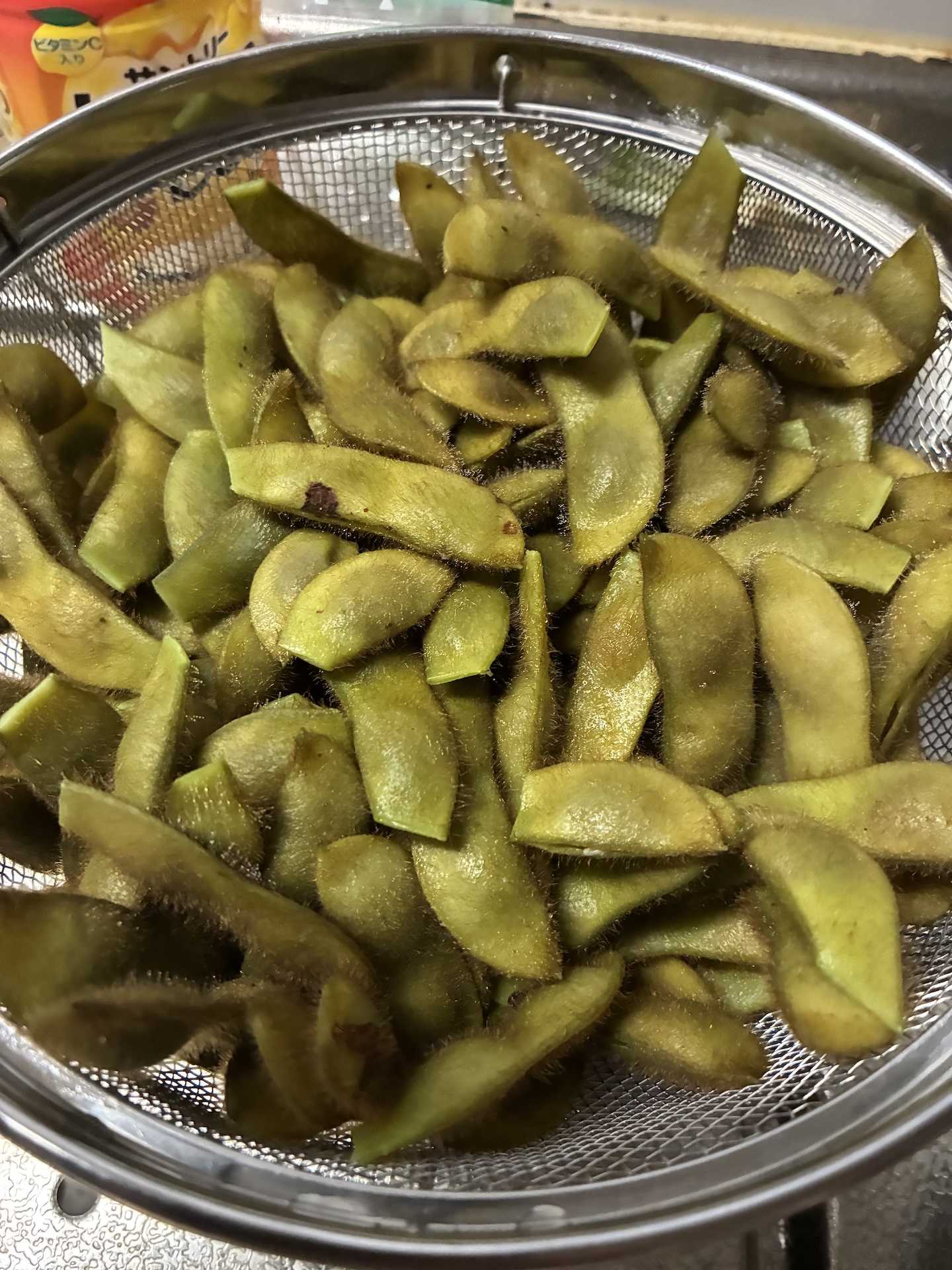 1年ぶりの塩ゆで。食塩はどのくらいやったかな・・・2%ぐらいかな・・・計らずに適当に放り込んだが、沸騰してから10分でまずまずゆで上がった。少し置いた方が味がしみるかな。シンクでざるにあける時には水を出しておかないと排水管を傷める。温度が下がったところで「うまくいったね」と女房と試食。2つや3つですまないのが枝豆。
