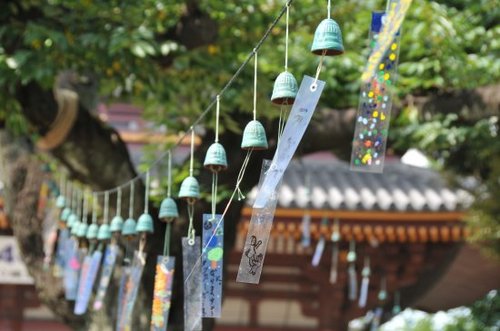 色とりどりの風鈴が大量にあると思ったら拍子抜け。青銅製の地味なものだったことと、境内がとても広いので、500個だとけっこう寂しい状況。とはいえ風鈴の音色は気持ちがいい。