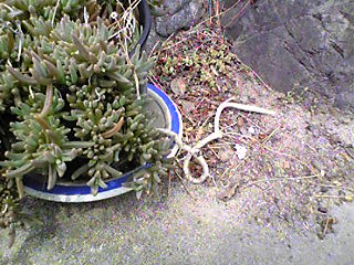 今日は汗ばむほどいい天気。庭の草引きをやっててこんなの発見!!随分前に友達に松葉ボタンを少しもらって。あとで庭の適当なところに植えようと思いつつ。その辺にあった植木鉢に突っ込んでた(;^_^A アセアセ・・・で、水遣りもしないのに、鉢いっぱいに増えてきたなー(;¬_¬)ジィィィと いつも見てた。o(`ω´*)oオイッ!さすが 松葉ボタンは強いなぁ・・・と。今日、草引きするのに邪魔なので、ちょっとこの鉢を除けるために、持ち上げようとしたら・・・ヽ(゜ロ゜;)ノ ウヒャァ鉢の下から 根っこが太く伸びて。鉢が置いてあった場所はコンクリートの上。おまけに その鉢はご丁寧に受け皿の上に乗せてあった。根っこは水欲しさに、土のあるところを探しまわったのね。やっとみつけたほんの少しの土の中に 根っこが 入ってる。まさに 臍の緒。生きていくために必死だったのね ( ̄ーÅ)ホロリちゃんと植え替えてやらなきゃ・・・でも、この臍の緒、土から引っこ抜くのって、何だか畏れを感じるんですけど。バチでもあたりそう …o(;-_-;)oドキドキ