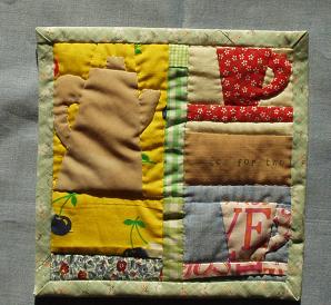ここのところしばらく暇を見てチクチクしていたものがようやく仕上がりました。 クローバーの手芸季刊誌「ビアンフェ」の企画で、一つのテーマで自由に20センチ四方のキルトを作成して送ると、ボランティアさんの手でつないで、一つの大きなキルトにしてくれるというもの。 毎年参加してみたいなあと思いつつ、今年が初めての参加です。 第8回の今年のテーマは「ティータイム」。 以前、図書館で見つけた「カオハガン・キルト」という、フィリピンのある島の人たちの作品集の中にあった、ティーポットとティーカップのデザインをお借りしました。 型紙も何もなしに直裁ちでチョキチョキ2枚の布を同じようにカットして、絵になる部分を入れ替えると、同じデザインで色違いの2枚のピースが出来上がるというもの。 ポットとカップの持ち手、注ぎ口と柄以外は、四角い布を縦横斜めにカットしたものです。 最初に1枚目、作ってみたら縁取り布が表にはみ出る分を考慮に入れなかったので、縁取り布がピースワークの絵柄に食い込んでしまい、失敗。 2枚目は最初の失敗を考慮して、何とか見られる形になりました。1枚目↓ 2枚目↓ 柄が入れ替わっているの、わかりますか~? “tea for two”の文字は、市販の英文字スタンプを押しました。1文字ずつのバラなので、微妙にずれてますが・・・。 送るのはもちろん2枚目、1枚目は自分ち用の鍋敷きにでもしましょ♪ 今回は、2月末の締め切りには余裕で間に合いました。応募者全員分を1枚につないで、夏の号に掲載されるので、1枚の大きなキルトの中から、自分のものを探し出すのが今から楽しみです♪ こうして手芸誌に作品を出すのも、地味~な自宅趣味(!?)にちょっとだけ外の世界の空気を吸わせてやれて、いいものです。(*^_^*)