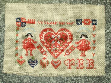 しかも、これはレシピではなく「面倒くさいから」という理由で、同じ色の部分から選んで刺していったら、上の段の「st.valentine」の最後の「e」のグレー部分が、布目を見誤ってきちんとスペースをあけていなくて、先に他の部分をあらかた仕上げてしまっていたので、刺せなくなってしまいました(;_;)。