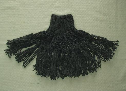 二目ゴム編みとネット編みにフリンジだけのこのネックウォーマー、マフラーだとほどけてずるずるひきずってしまう子供にはピッタリです。