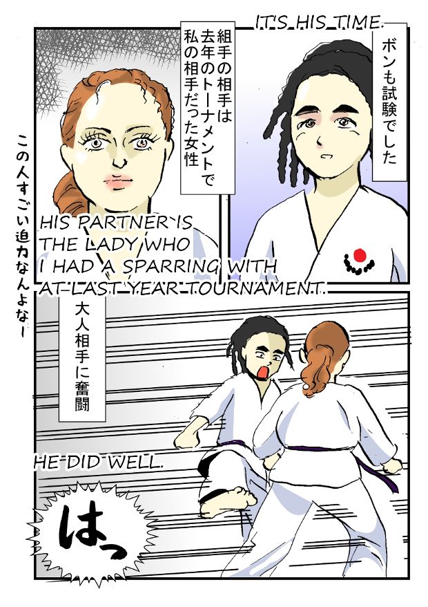 親子で無事昇級できました。私と同級で、いつも並ぶ時隣にいた背の高い男性(腰が私の胸の位置)、コンパクトカーに乗って帰って行ったのがツボでした。
