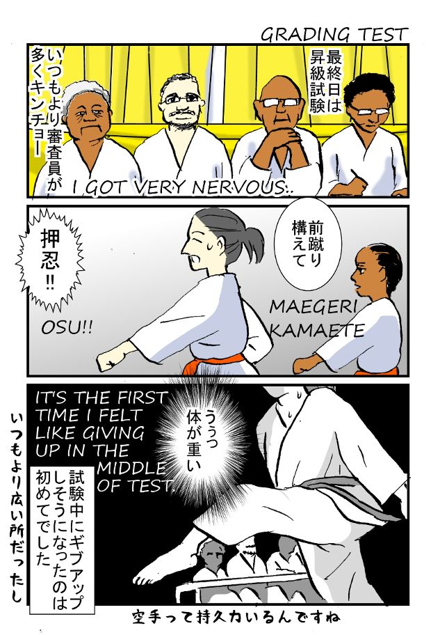 昇級試験は幹部が前に並び、とても緊張しました。場所も広いので動き回らなければならず、途中でギブアップしそうになりました。空手って持久力いるんですね。