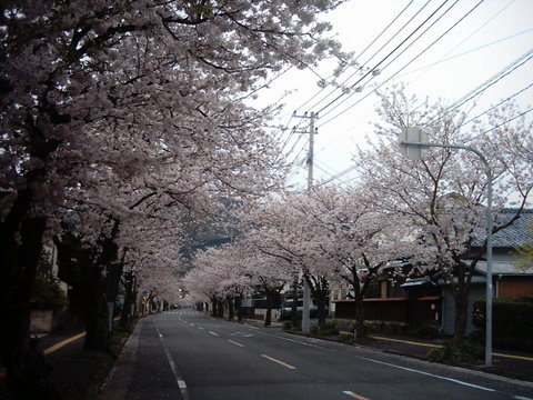 桜が満開の実家の前の道・・・・・・ ランも桜の前で ・・・