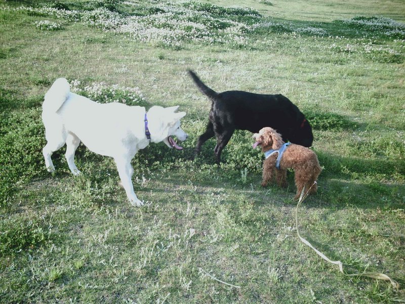 ・・・ 遊び相手を探していたら ・・・お友達が・・・ 黒ラブさん と トイブードルさん ・・・・・・ 黒ラブ さん 少し元気になったようです ・・・・・・ 隠れていた プードルさん に ・・・・・・ 追い掛け回されている ラン ・・・・・・ 黒ラブさんが 中に入って ・・・・・・ そこへ またまた お友達 ・・・ ・・・ ランはその時 ご挨拶??? おねだり??? ・・・・・・ それから ・・・