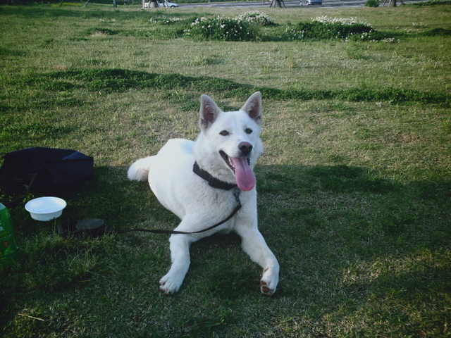 ・・・ ドッグランに先客が ・・・夕方の散歩・・・いつものように遊び場へ はなちゃんが旅行でいないので、遊び場ですこしあそんでドッグランへ行く・・・今日はドッグランに先客がいる・・・黒のバンダナのワンちゃんがお父さん、ピンクのバンダナのワンちゃんが娘さんだそうだ、名前を聞いたのだが 忘れてしまった・・・・・・ おもいきり走り回ることはないが 遊んでもらって ・・・・・・ お父さんは凛々しい立ち姿 ・・・・・・ 娘さんは ゴロゴロ どこかの家族を見ているようだ ・・・お二人さんが帰った後、遊ぶ・・・最後はこんな表情で・・・