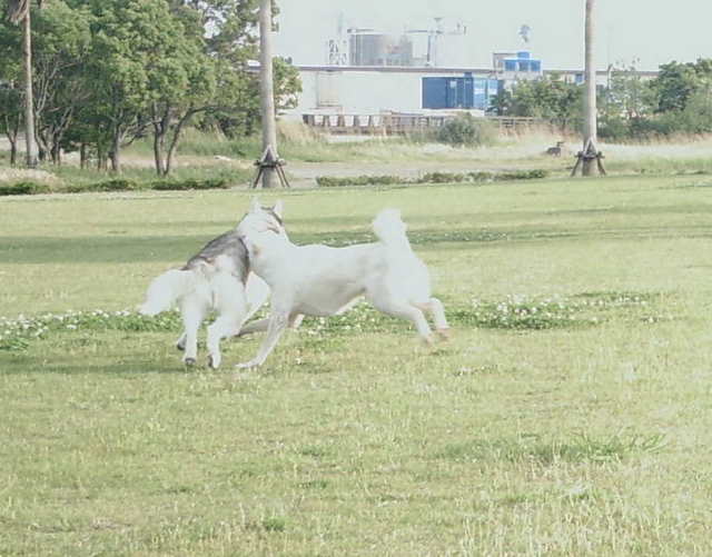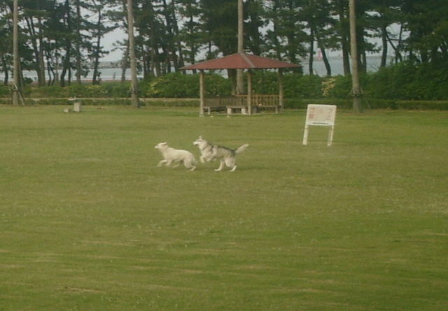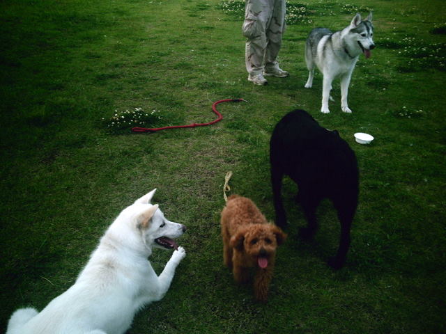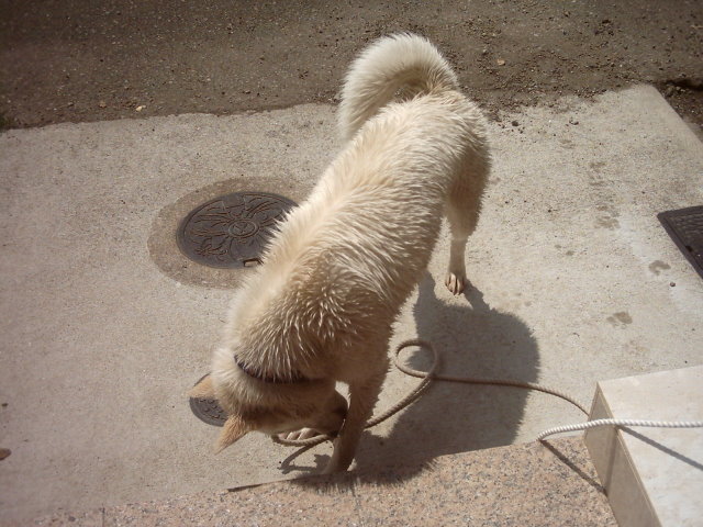 ・・・ ランのシャンプー と チーの水浴び ・・・チーを水浴びさせたので、ついでにランをシャンプー、もともと川の中に平気で入っていくラン水をかけても、シャンプーしてもべつに嫌がることはない・・・しかし、その後が大変、タオルで拭こうとするとタオルが遊び道具になってしまう・・・・・・ チーの日光浴 ランが見張り役 ・・・夕方の散歩、はなちゃんと遊ぶ・・・写真撮ったのだがまともな写真は一枚もなし・・・・・・ 散歩の帰り道 ちび ちゃん と はるちゃん に出会う ・・・・・・ ランは ちゃっかり おねだり ・・・今朝の散歩・・・ 鴨たち、今年もこの川で夏を越す鴨がいるのかな・・・いつもの場所で遊んだ後・・・・・・ チー チー相変わらずの食欲・・・チーの餌、 ドッグフードの練り餌から粟玉だけに変えることに それに水を・・・