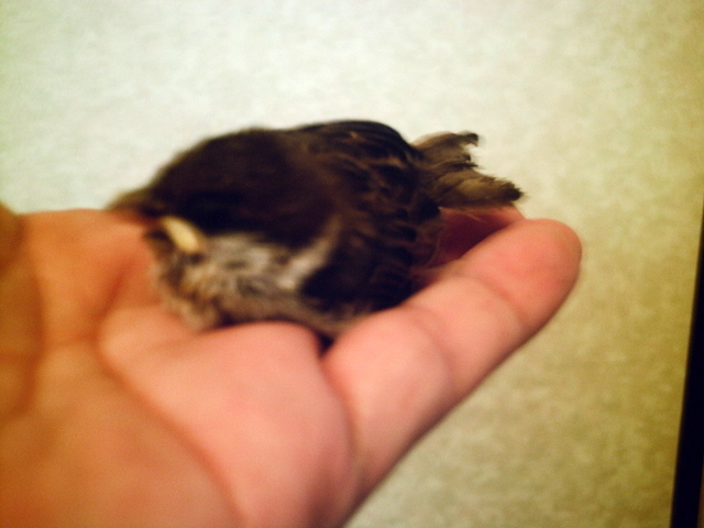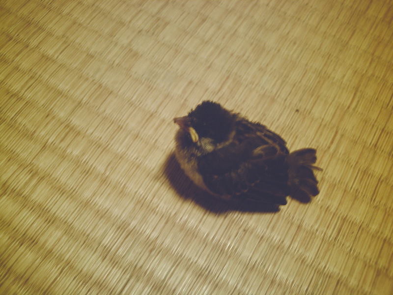 ・・・ ランの初めての獲物??? ・・・4月30日 夕方の散歩・・・ランが急に足を止め、耳を立て立ち止まって、一点を見つめている、落ち葉かなと思いつつ近寄っていくと、そこには・・・ これが ↓落ち葉の中にうずくまっている すずめ・・・まだくちばしが黄色いどこかの巣から落ちたのか、巣立ちが早かったのか???・・・ランが近寄っていっても逃げようとしない、ランはクンクン・・・もし動いていたら、パックとやってたかもしれない・・・私が捕まえるとランは気になるようで、すずめを持った手をクンクン・・・顔をみせると ペロリと舐める・・・このままにしていたら、猫かカラスの餌食になると思い持ち帰ることに・・・家に帰って早速餌を、メジロの餌が一袋どこかに残っていたような・・・探し出して、餌つくり、ネットで調べるとドッグフードでもいいようだ・・・食べてくれれば大丈夫なのだが、なかなか食べようとしない、無理やり口に押し込んで・・・以前拾った すずめは、口の前に餌をちらつかせると口をあけてくれたのだが・・・気長に餌をあたえるしかない・・・ 元気になればよいのだがこの2日3日が峠かな・・・・・・ 朝の散歩 お友達のブルドッグ ・・・我が家に来たときのランはこのぐらいの大きさだったのかな・・・