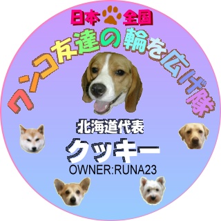 ビーグル仲間さんの☆ゆう33☆さんやkeicocoさんに教えて頂きました♪3匹のワンちゃんのママさんかうりさんが只今、日本全国「ワンコ友達の輪を広げ隊」のお友達を募集しています。「ワンコ友達の輪を広げ隊」にエントリーするとこ~~んな素敵な認定証を作ってくださいますよ北海道代表としてゆうさんちのもんちゃん&しゅうちゃんと一緒で~~す♪かうりさんありがとうございます全国の愛犬家の皆さん、そして飼っていないけどワンちゃんの大好きな皆さん一緒に「ワンコ友達の輪を広げ隊」のお友達になりましょう~♪
