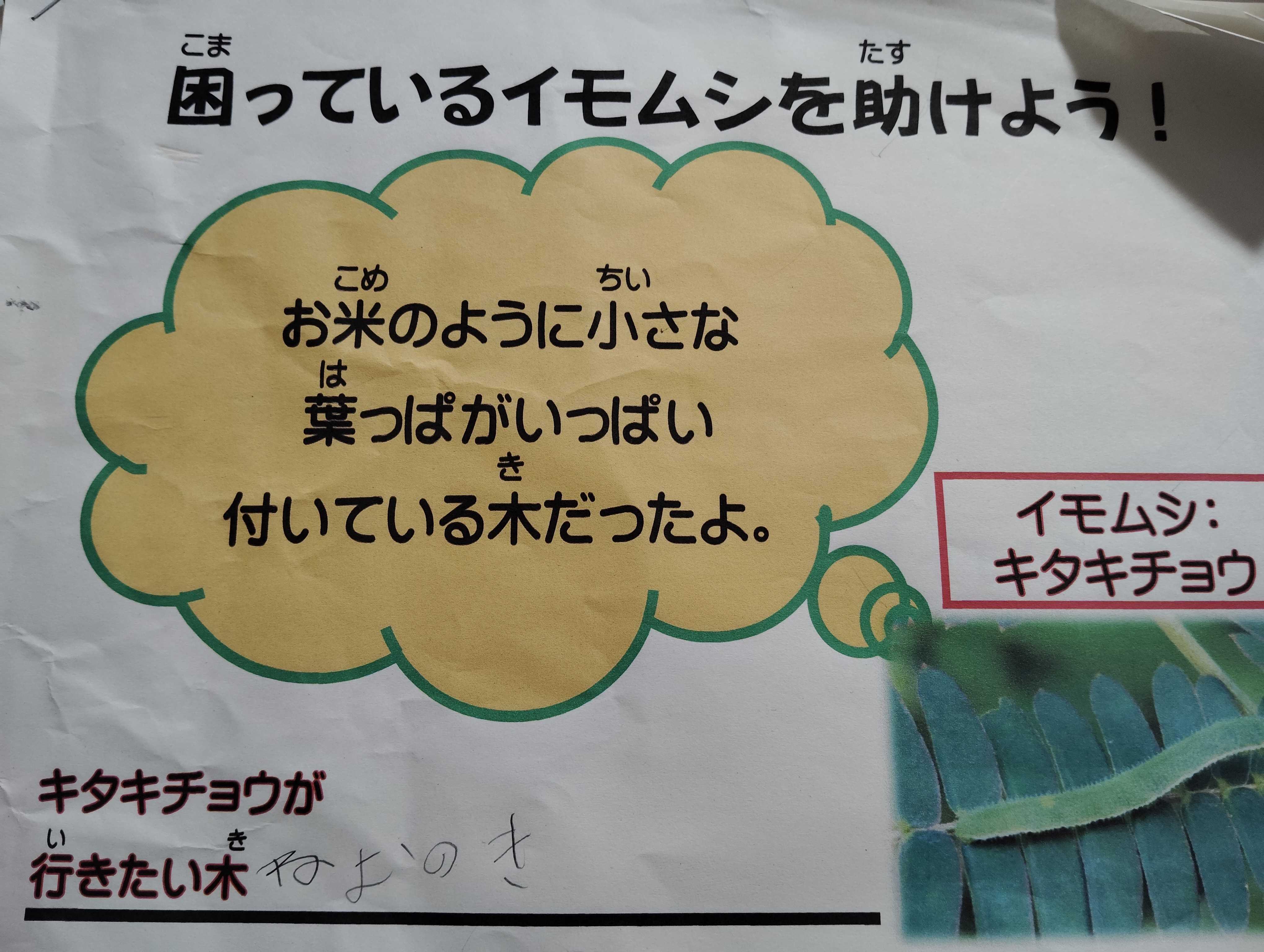 子どもと一緒に、イベントに参加しました自然を探索して、木や草、虫を探します虫を見つけるには、虫が好きな木や草を探すこと、虫そのものではなく、痕跡を探すことも楽しいことを知りました会場が動物園だったので、空いた時間にアオダイショウ触らせてくれました初めて触ったのですが、冷たくてツルツルしていました子どものお陰で、楽しい経験ができました写真は、クイズの1ページ