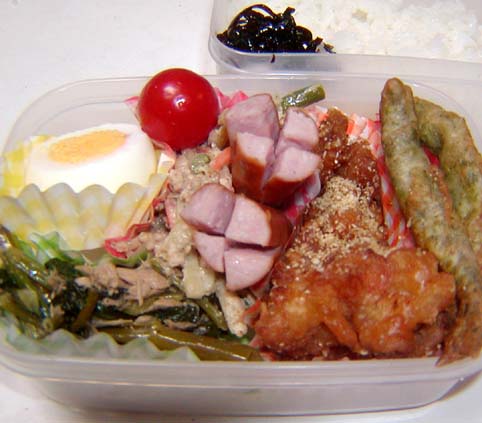 小鰯の天ぷら、ゆで卵、牛蒡サラダ(昨日作った残り)、空芯菜とツナの炒め煮、ウィンナー、鶏唐甘酢胡麻ダレ、紫蘇昆布、プチトマト一昨日、遂に教育実習中の長女が風邪を引いてしまった。本日4回目の授業があるので、昨夜はほとんど徹夜状態だった。こっちは健康管理面で一生懸命サポートしていたつもりだったが私の力の及ばない部分がどうしてもあるのは仕方ない。金曜日に最後の授業をするので、何とか乗り切って欲しい。