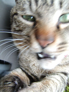 うちのぐうたらネコのこの顔って、何だか人の顔に似てないですかねぇ・・・。今朝から、声がかれてて「ニャ~」って鳴かないで低くハスキーに「ビャー」って鳴きます。風邪気味なのかなぁ・・・?でも、食欲はあるんですが。