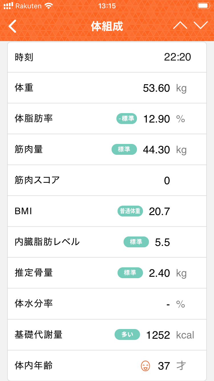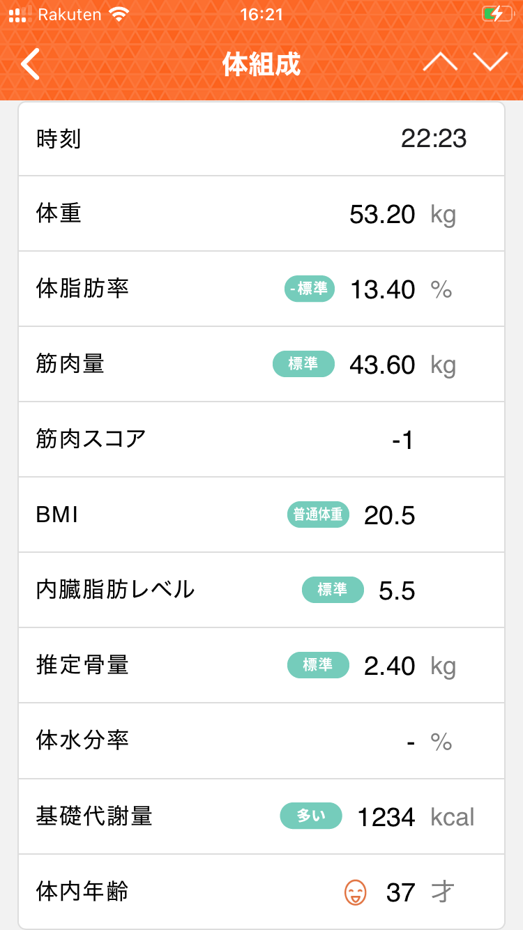 どうも鈴木さんです。体組織計の測定はほぼ毎日継続していますが日記の更新は時間あるときだけなのでデータが溜まっていくだけでなかなか最新の数値まで追いつかないですね。アプリ連携ないほうの体組織計は今回が最後のデータなので少しは更新楽になる。ポイ活も兼ねて記録してる楽天ヘルスにもきちんとTANITAアプリのデータがappleヘルス経由で共有出来てますね。手動での共有必要がないのは楽で良いですね。最後の手入力データ(omron計測値)体重:54.9㎏体脂肪率:21.1%内臓脂肪レベル:7骨格筋率:36.5%体年齢:38基礎代謝量:1383kcalBMI:21.2