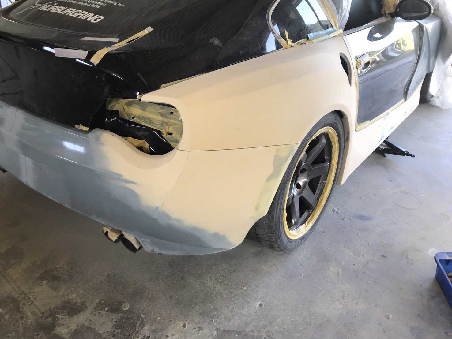どうも鈴木さんです。毎回書き出し似てますが当方ブログの中でも不人気ジャンルの車ネタです。少しづつですが作業進んでいるのでやる気維持の為にもブログ更新してネタだししていきますよ。車両本体の年齢もそろそろ20歳と超高齢期に突入しそうなBMWですが公道復帰に向けて直しております。元の型では歪みや凸凹だらけでしたがやっと表面出しまで来ました。サイドステップも左右の寸法違いの修正まで終わり最終段階です。リアフェンダーはまだまだ盛って削って歪みとっての調整中です。削ったらまた盛って左右の差をなくしつつ単品の製品精度上げていきます。ホイールに合わせてチリまで合わせるのでスペーサーなしで車検対応になる筈街乗りようの足車が欲しくなりますがここは浮気せずに本命BMWの完成を待つぞい!!