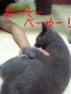 ちっさいおっさんです。うちの竜太朗は遊んでほしいとガブッと手をかみます。その威力はものすごいです。竜:「早よ、遊べやー」ものすっご痛いです。すごく痛いので、じゃらしーで遊んであげます。(クライス。曰く、私は猫心をわかっていないらしく、竜太朗さんのじゃらしーへの食いつきは悪いです。)ものすっごキックです。ものすっごカミツキです。お、今日は食いつきいいんじゃないの。しかし、三分後・・・竜:もう無理っす。早くないっすか、竜太朗さん。まだ三分ですよ、もう少し頑張ってくださいよー。私もやる気になったんすからー。竜:「おまえのじゃらしーなんか違うねん。グッとけーへんねん。」ち:「なにがちがうねん」竜太朗さんがわがままなのか、私が下手なのか、わかんないけどもう少し頑張ってよー。ちょっとデブってるんですから。