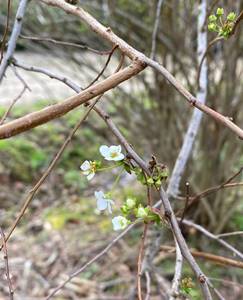実家の畑で大株になっている雪柳が早くも開花していました。