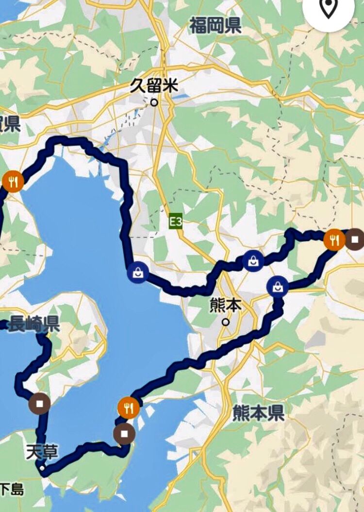 天草半島の北側の海岸線を通って、天草五橋を渡り、熊本本土に向かいます。