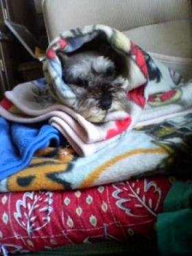 うちのルークさんは寒がりである。最近は僕の膝の上がお気に入りで甘えて鼻をク~ンと鳴らして乗っている。昼間は大抵こんな感じで毛布にくるまっている。まだ1歳半だがジジくさい奴である。