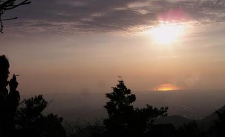 伊勢湾が朝陽の照り返しで光っている。コンビニで買ったおにぎりを食べてキットカットを食べた後に煙草に火をつける。日頃の喧噪から離れた静かなひと時。このあと雲が広がってきて、僕らは下山を始めた。ガリガリに凍った斜面を降りて行く。ほどなくして4人組のパーティーと擦れ違う。「こんな時間にもう降りて来たんですか?」「日の出を見てたんですよ」相手はびっくりしていたようだ。考えてみると、いかにも彼らの方が人間らしい。早朝発、夕方下山の一般的な行動時間である。僕達は、獣だ。漆黒の森を歩き、岩の上で朝陽を迎え、魔法が解けないうちに山を降りる。人間の世界に戻るとするか。