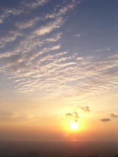 どんな色の夜明けになるかは予測不可能である。雲一つない星空の下をライトを持って歩き木々の間から時折見られる街の夜景を眺め漆黒の森に誘われるように登山道を行く。崩壊された登山道を回り込んでロープを伝って登る。いつしか星がひとつ、またひとつ消えて街の明かりも薄らぐブルーアワーとなった。暗くて気付かなかった日陰の積雪も見えてきた。快晴無風だと何となく明るくなり何となく陽が昇ってしまうことが多い。空が茜色に染まることなく、ただ白い朝が来る。この日も快晴無風。しかし日の出少し前に西の山側から雲が湧き北西の風に乗って天頂に高い雲が漂った。きれいな朝焼けになる予兆である。太陽が昇る直前から雲は紅く染まりもはや言葉は何も出ない。空は高くてどこまでも広く続き完璧な朝焼けを見れたことに心から満足した。