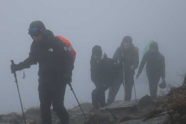 悪い視界の中を登るネパール人ガイド、韓国人2人、マレーシア人。