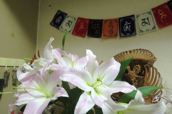 後方のカラフルな旗はネパールで買ったタルチョー。