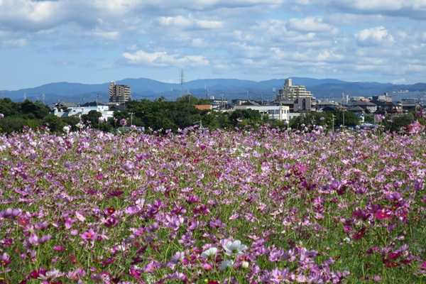 満開のコスモス畑の向こうには人工の建造物が見渡せる。