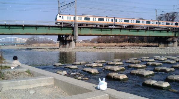 今日は朝からママさんが美容院に出かけて、久しぶりにりょうまると二人で遊んだ。「どこか行きたい?」聞いたところ「電車、みる~♪」と言うことで中央線を見に行くことにした。北野公園に車を停めて公園に程近い浅川の川沿いに行ってきた。ここは鉄道ファンの間でも有名な撮影スポットみたいです。京王線と違って中央線は電車のバリエーションが多く、りょうまるもお気に入り。↑一番よく走っている、E233系。それを見送るりょうまると相棒の中トトロ。↑たまに通るローカルな115系。(最初名前が分からなくてウィキペディアで調べました・・・)それを見送るりょうまると相棒の中トトロ。↑「スーパーあずさ」タイミングよく撮れた実はりょうまるが一番好きな電車は「貨物列車」なんだけど、今日は日曜日ということもありあまり走っていないようで、1時間半位同じ場所にいたけど出会えずじまい。そうこうしているうちに、ママから「美容院終わった」メールが来たので「また今度ね~」っとその場を後にして、ママを駅まで迎えに行きました。
