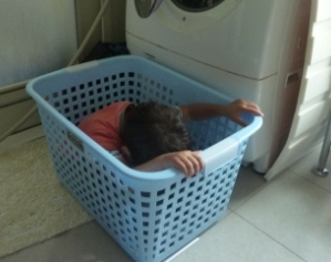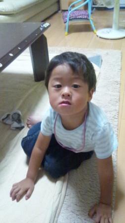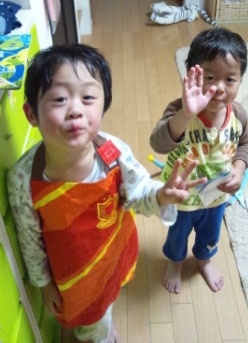 洗面所で「おかあさ~ん」と呼ぶので「なぁ~に」と見に行くと 「謙真くんど~こだぁ」とかくれんぼ (丸見えだけど・・・ね) 「けんしんどこかなぁ~」と言うと 「ここやんか」とニヤリ顔でした