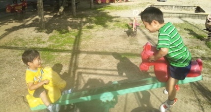 幼稚園から帰ってきてもまだ遊び足りないみたいで「おかあさん公園に行こう」と言うので少し離れた公園へ (自転車で5分だけどね・・・) 公園に着くと誰もいなくて貸し切り状態でした 「謙真これしよう~」とシーソーへ 1度上がると下がらないので私もお手伝い 「ギッコンバッタン~」と2人とも大笑いしていました