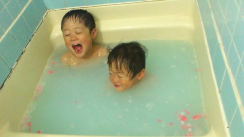 普段、家のお風呂では入浴剤を使わないのですがじぃじばぁのところで一度、入浴剤を入れてもらった事がありおばあちゃんの家に遊びに行くと「お風呂入ってもいい」と聞く諒真そして、今日も・・・「お風呂に入っていい」と聞き 青色の入浴剤を入れてもらいバラのお花も浮かべてもらうと「キャーお花や」と大興奮 30分以上2人で楽しそうに入っていました